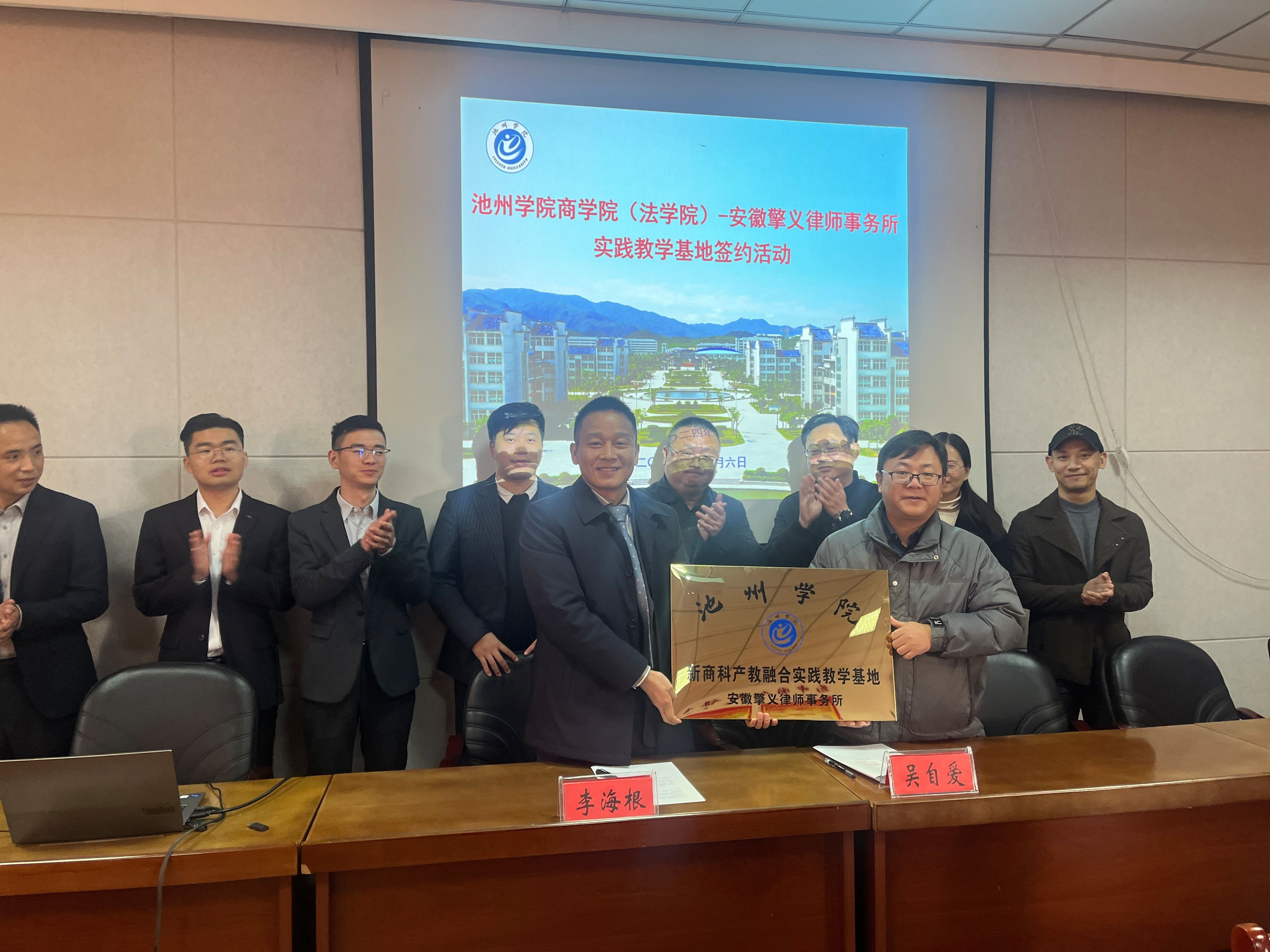 12月6日下午,6165cc金沙总站检测中心(法学院)与安徽擎义律师事务所实践教学基地签约授牌仪式在博识楼会议室举行。6165cc金沙总站检测中心(法学院)党委书记肖宁生、院长吴自爱,安徽擎义律师事务所副主任李海根、专职律师韩毅、王静等出席了签约仪式。