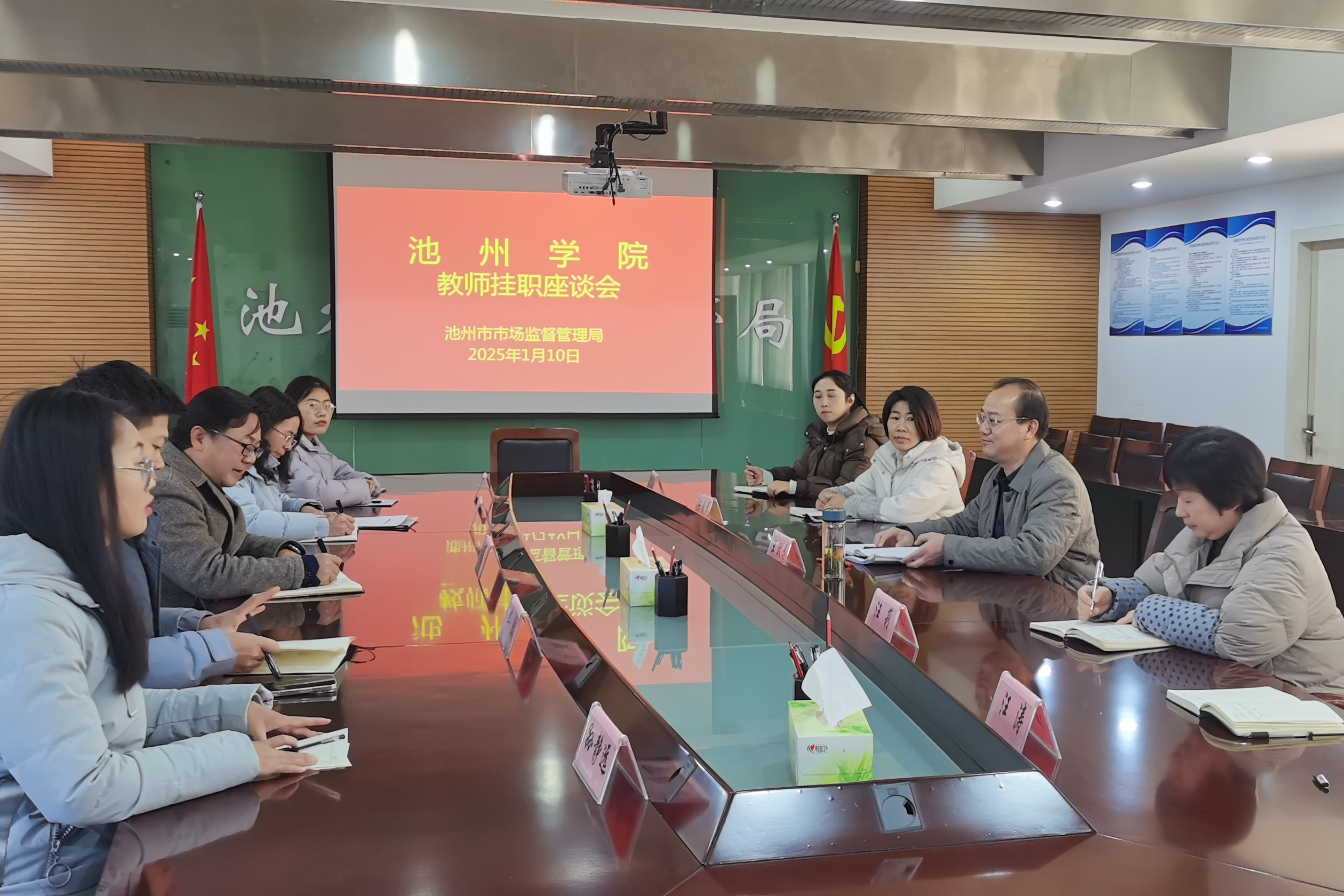 2025年1月10日,6165cc金沙总站检测中心(法学院)与池州市市场监管理局开展教师挂职座谈会。池州市市场监督管理局副局长王效愚、6165cc金沙总站检测中心(法学院)院长吴自爱等出席了此次座谈交流会。