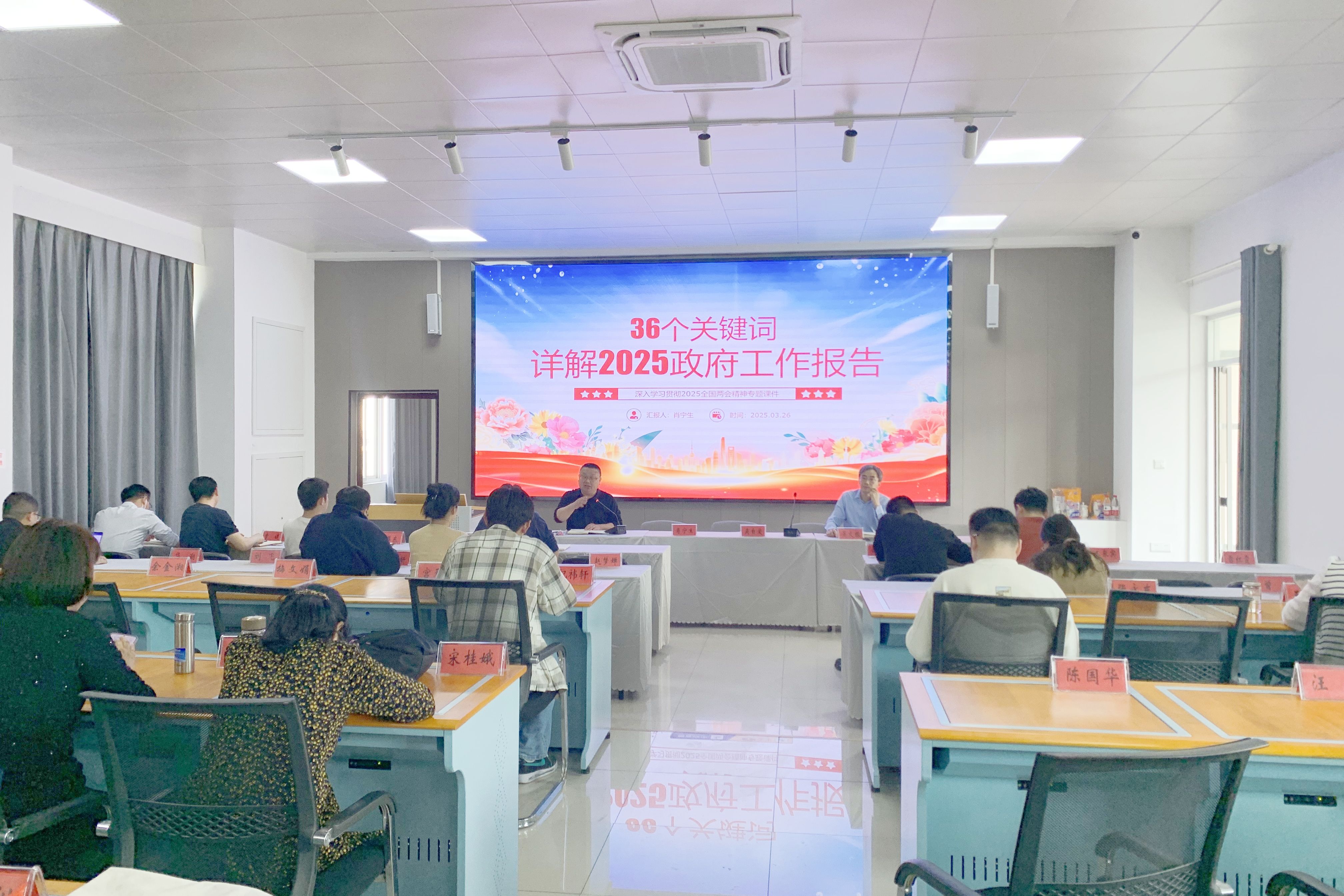 2025年3月26日,6165cc金沙总站检测中心(法学院)全体教职工在博识北401召开学习贯彻2025年全国两会精神专题会议。学院党委书记肖宁生主持会议并作“36个关键词详解2025政府工作报告”专题辅导。