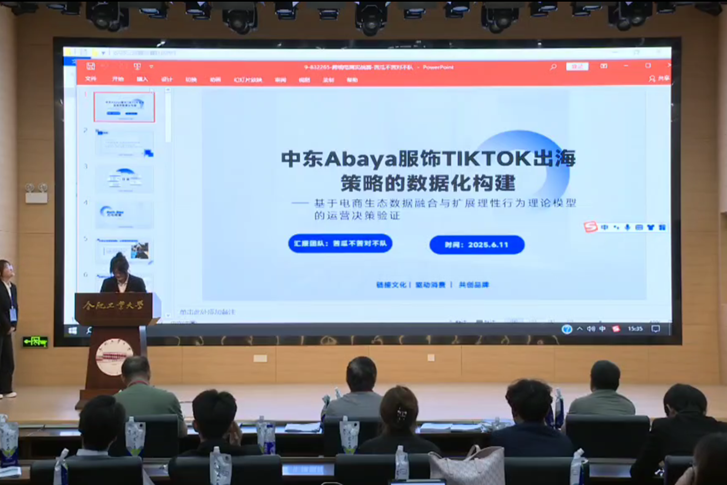 本次大赛共有来自全省53所高校共5518支队伍参赛,分为分组赛和终极赛两个阶段,分组赛共分9组,其中常规赛道5组,实战赛道4组,采用PPT答辩、专家评委现场询问的方式进行。在跨境电商赛道中,《中东Abaya 服饰 TIKTOK 出海策略的数据化构建》(指导老师:何佳莹、崔凡)通过深度挖掘中东服饰文化内涵,创新性构建数据化运营模型,成功打通传统服饰产业与社交媒体营销的融合路径,为民族特色产品出海提供了可复制的数字化解决方案,获得了该赛道特等奖。